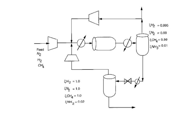 The ammonia product is recovered by flashing the reactor effluent in two stages and recycling the overhead vapour. If the purge fraction is 5% for the high pressure recycle, what is the methane concentration in the reactor feed?