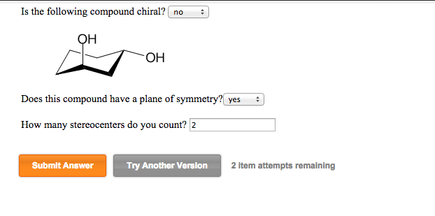 Show transcribed image text Is the following compound chiral? Does this compound have a plane of symmetry? How many stereocenters do you count?